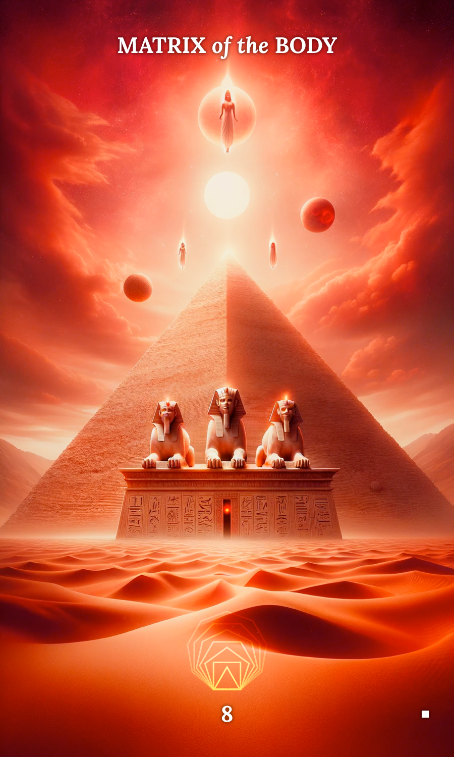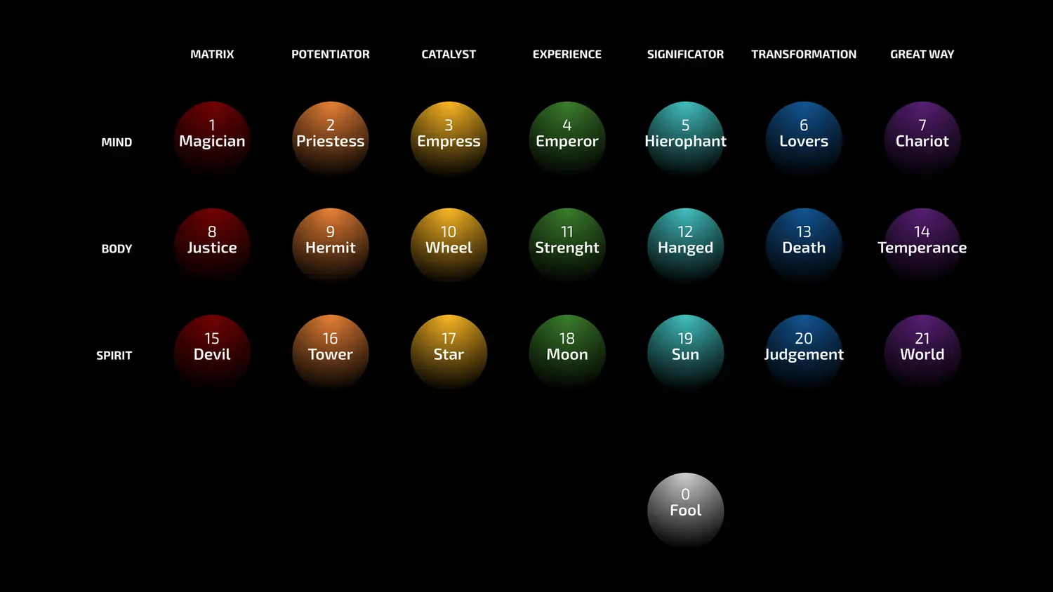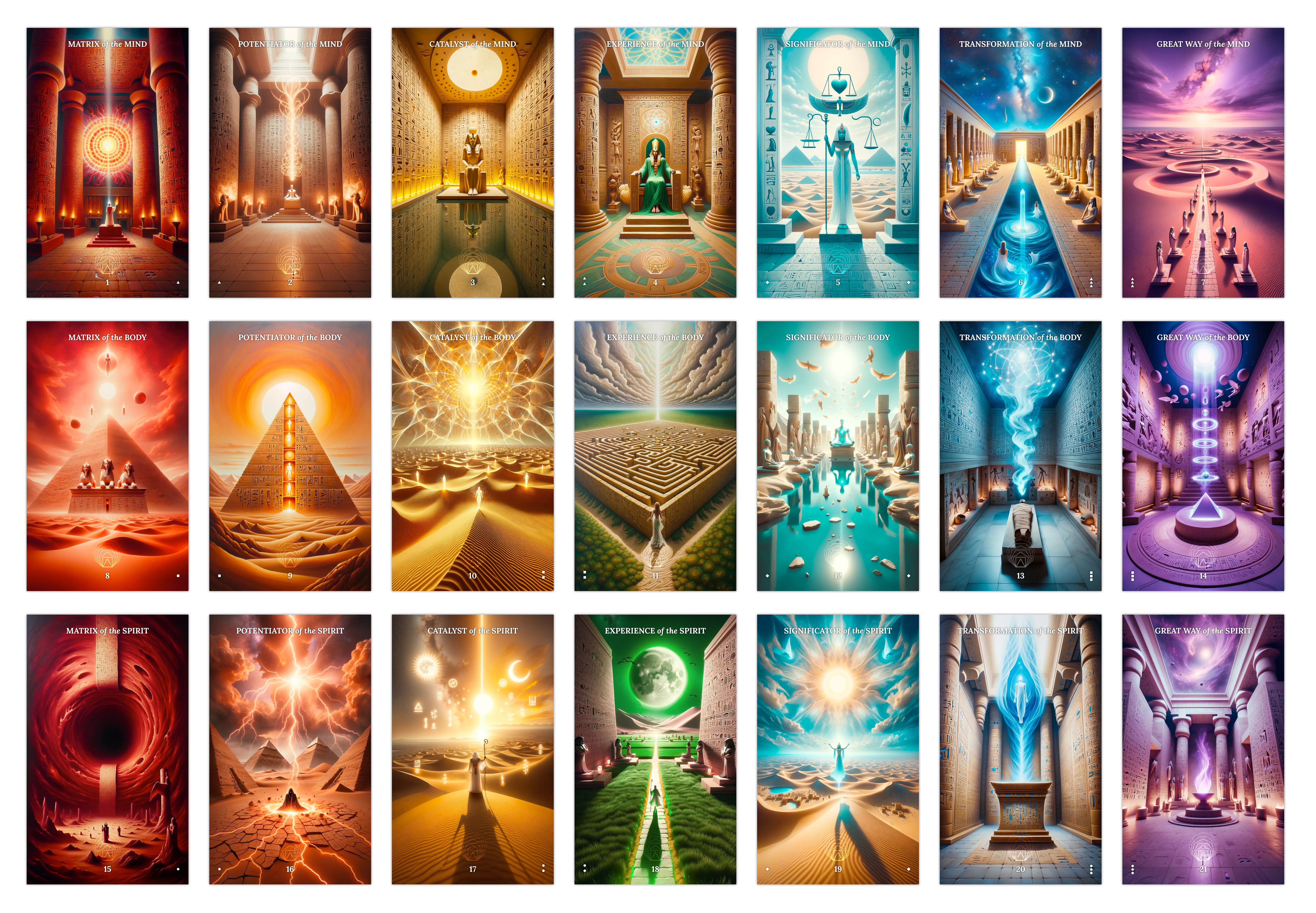 MATRIX These cards are considered to be the foundational cards representing the core aspects of each cycle. | ![]() Matrix of the Mind Represents the conscious mind and its potential to create and shape the individual's reality. It symbolizes the inherent power of the conscious mind to focus intention and manifest experiences. | ![]() Matrix of the Body Represents the physical body and its ability to experience the material world. Symbolizes the inherent vitality and strength of the physical form and the role it plays in shaping the individual's life experiences. | ![]() Matrix of the Spirit Represents the higher self or the divine aspect of the individual. It symbolizes the spiritual essence that exists within each person, often obscured by the illusions and distractions of the material world. Invites individuals to transcend their perceived limitations and connect with their true spiritual nature. |