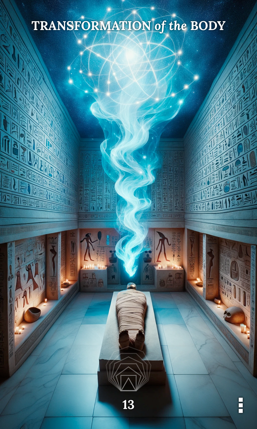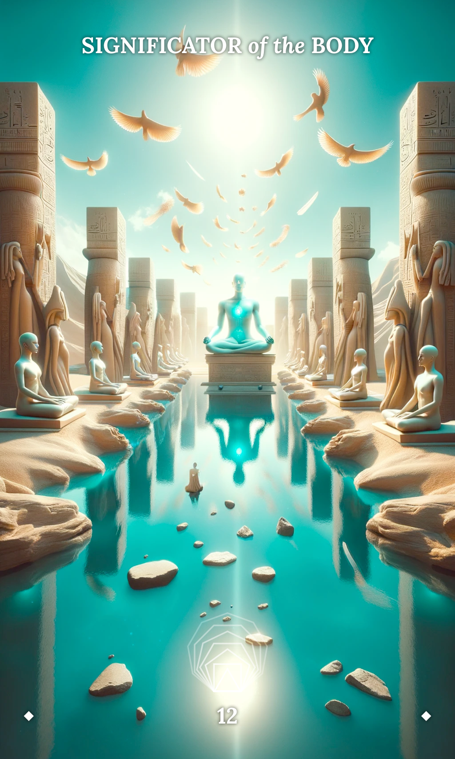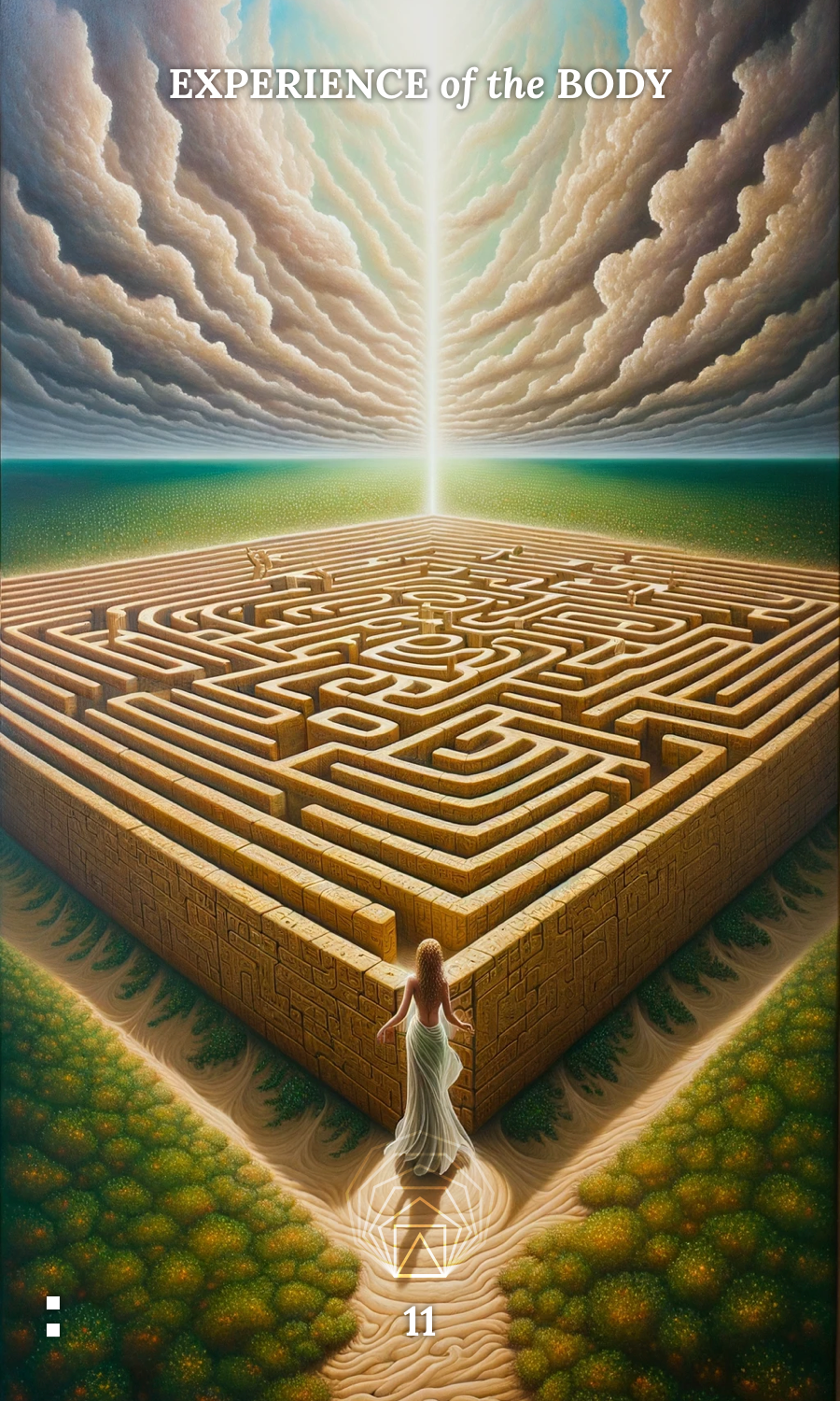 MIND These images relate to the experiences of an individual's physical body and how they influence the mind. They represent the intersection of mind and body, and the role of the body in shaping an individual's consciousness. | BODY This group of images corresponds to the processes and experiences within an individual's conscious mind. It includes the ways individuals perceive and interact with their reality. | SPIRIT This group of images pertains to the spiritual aspects of an individual's existence, including their connection with the divine or the higher self. These images explore the journey of spiritual awakening and evolution. | |