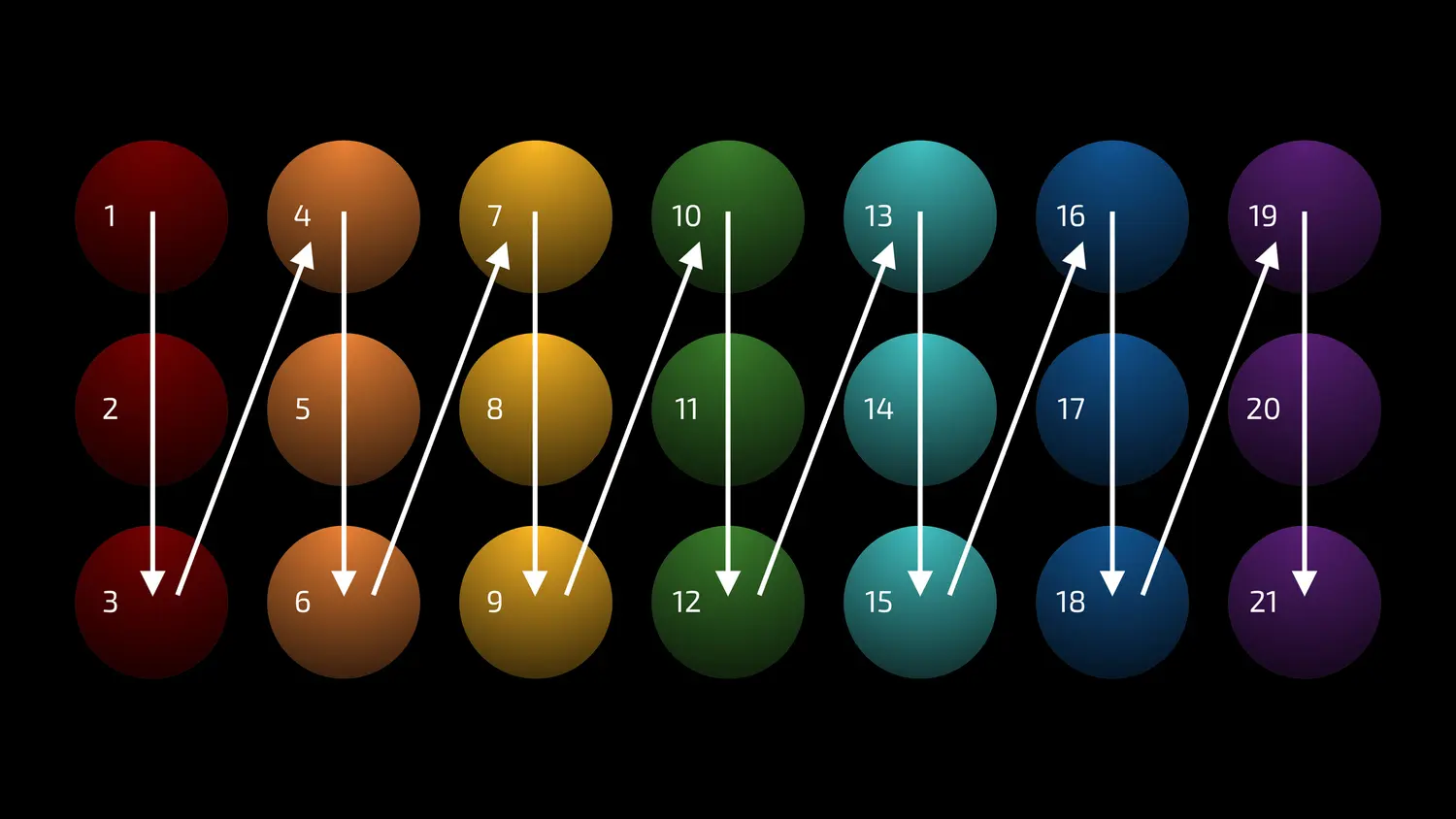 Ra recommends reading the cards differently. Instead of looking at the Majors as three sets of seven, Ra recommends seven sets of three: