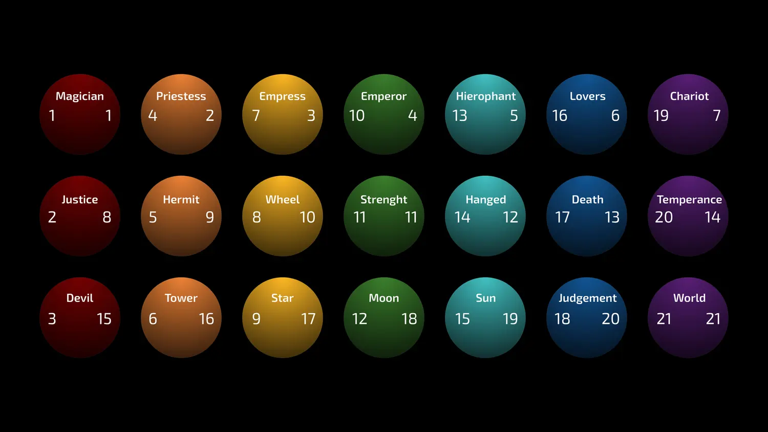 Traditional Tarot organizes the Major Arcana according to the hero's journey, starting at the Magician, followed by the Priestess, the Empress, and so on.