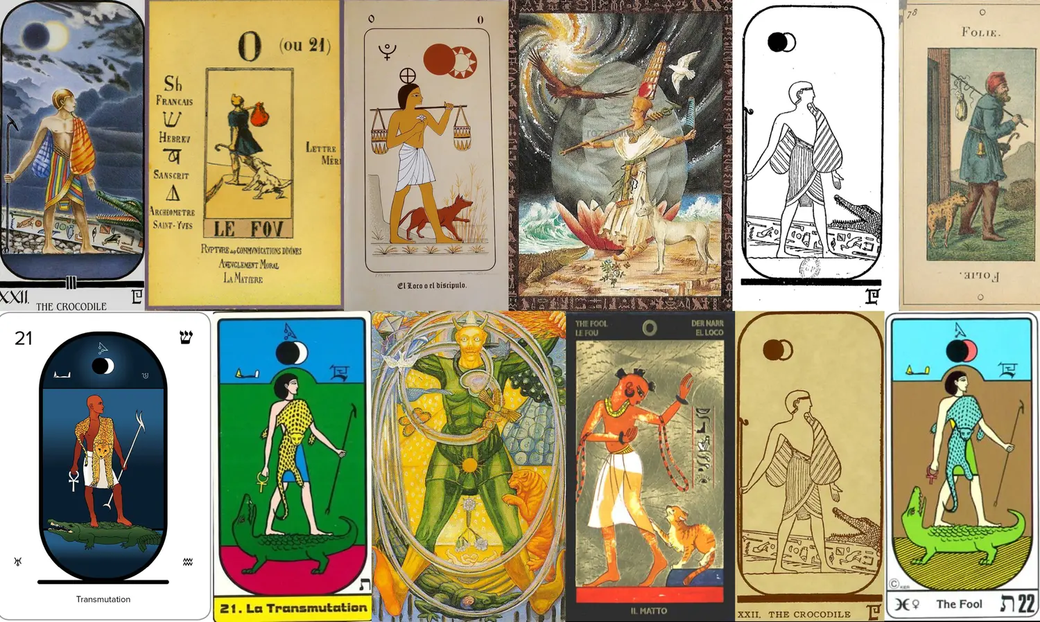 Collage of 'Fool' cards from various Egyptian Tarot decks.