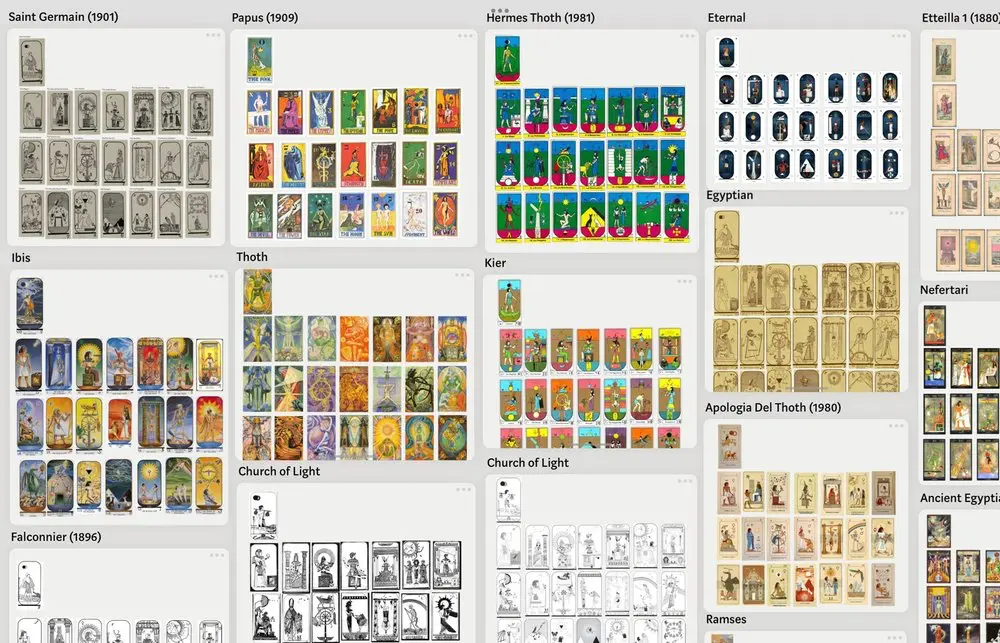 Screenshot from Muse where I'm organizing images, texts and handwritten notes on iPad + Mac, including various Egyptian Tarot designs.