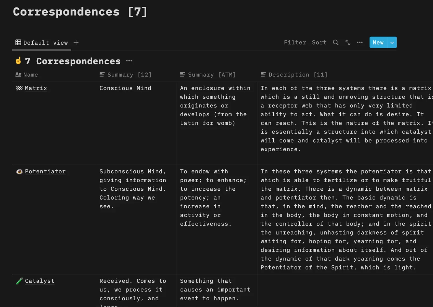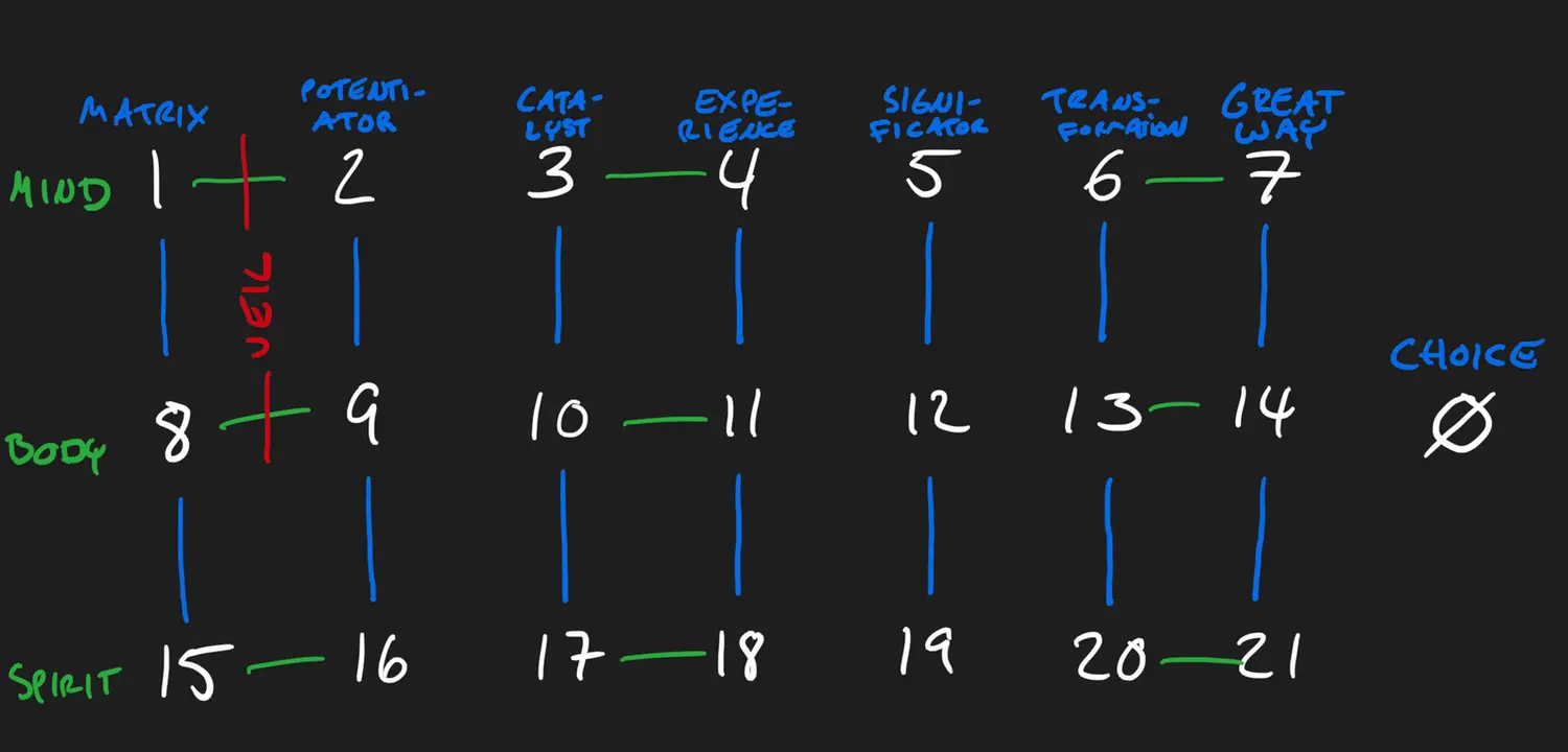 Each octave, or correspondence, represents a transition or phase in the development of the adept. These shall be explored in further detail, but are called: Matrix, Potentiator, Catalyst, Experience, Significator, Transformation and Great Way. - 3 Foundations