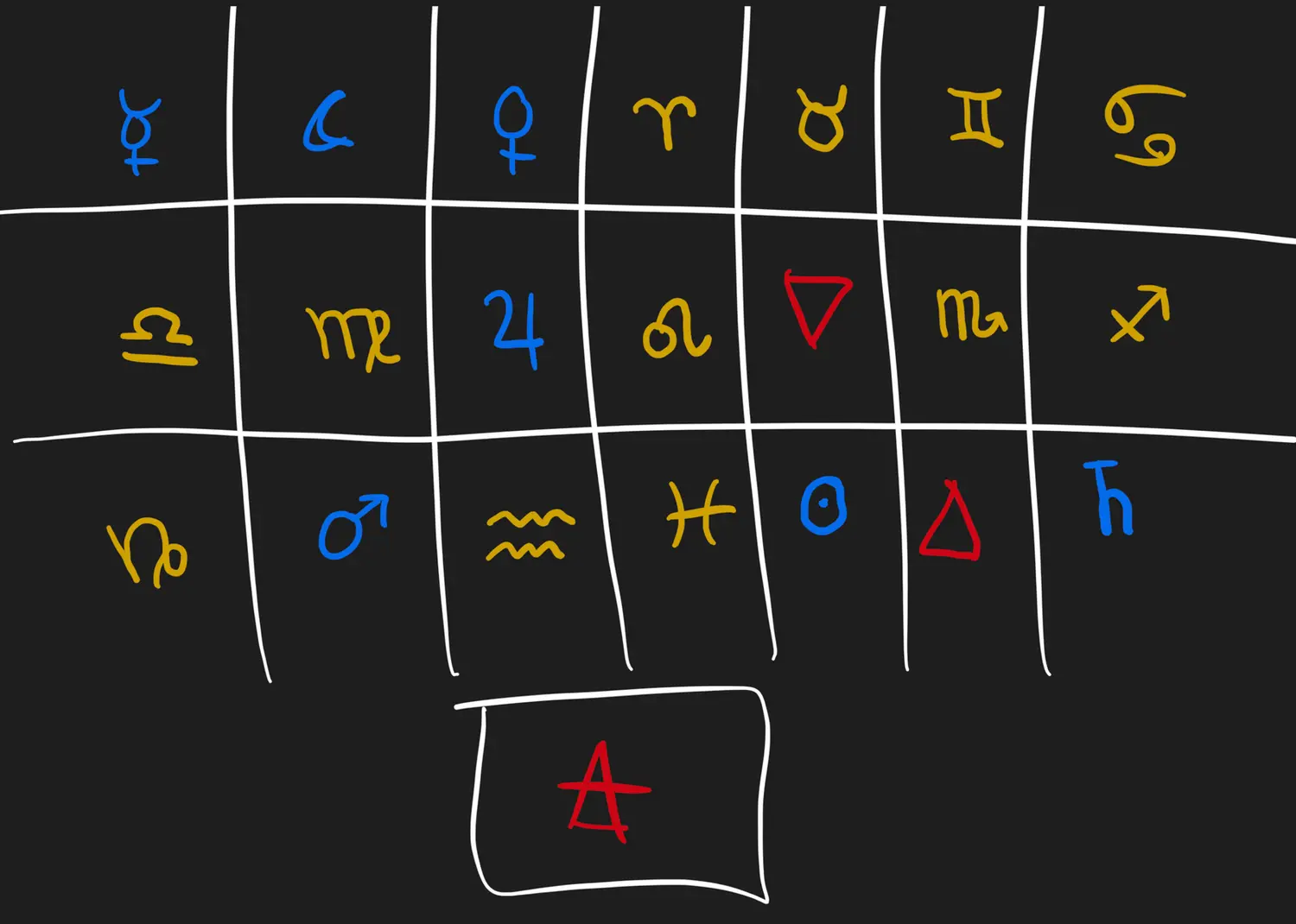 Hand-written snapshot from iPad Notes, showing correspondences between the arcana and astrological signs (blue = planets, yellow = signs, red = elements)